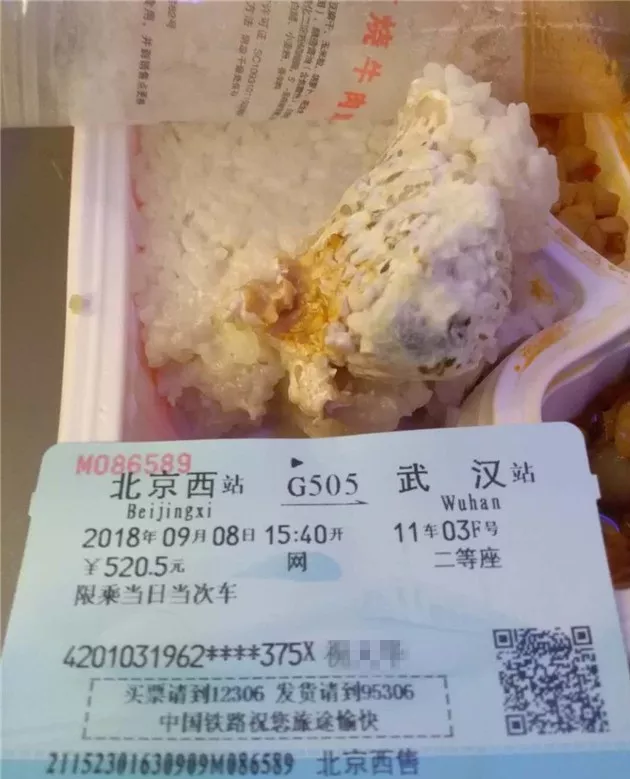 據(jù)報(bào)道,北京開往武漢一高鐵供應(yīng)40元盒飯竟然發(fā)霉, 旅客食用后出現(xiàn)上吐下瀉的狀況。9月8日晚,來自武漢的兩位旅客乘坐高鐵G505從北京回武漢,晚上七點(diǎn)多鐘二人到餐車去買了兩盒盒飯,打開一看,嚴(yán)重發(fā)霉變質(zhì)。其中一位旅客看到食物發(fā)霉之后,立即向列車上工作人員投訴,并拒絕了列車工作人員退還餐費(fèi)、重新?lián)Q套餐的處理方式。另外一位旅客則因?yàn)槭秤眠^半,出現(xiàn)了上吐下瀉的狀況。