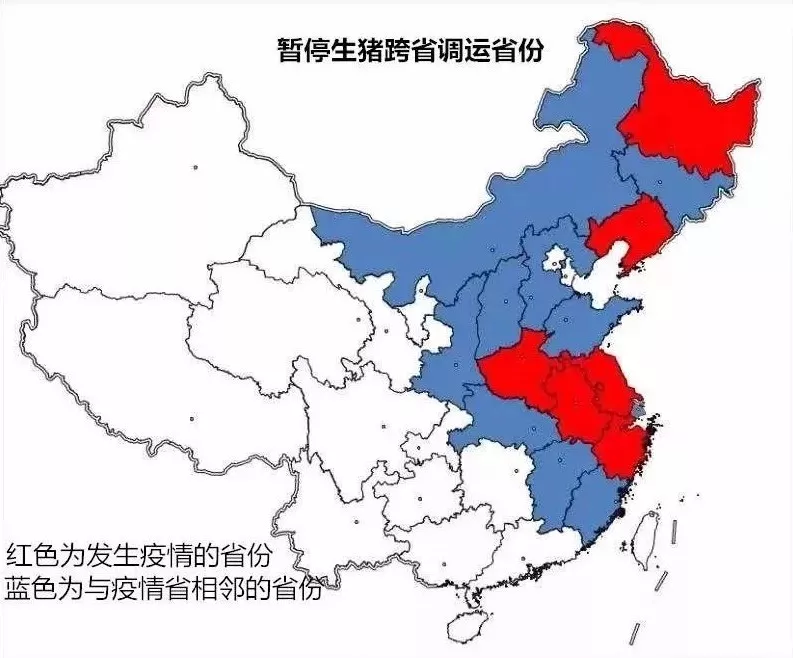 目前全國共有6省份出現(xiàn)了非洲豬瘟疫情,分別是遼寧省、河南省、江蘇省、安徽省、浙江省、黑龍江省。再加上此次10個(gè)與發(fā)生非洲豬瘟疫情省相鄰的省份暫停生豬跨省調(diào)運(yùn),全國共有16省份暫停了生豬跨省調(diào)運(yùn)。