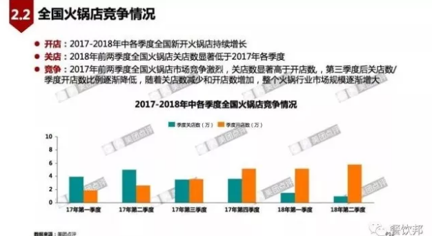 全國火鍋店數(shù)量在2017年穩(wěn)定維持在30萬左右,二、三季度略低于一四季度;2018年前兩季度全國火鍋店數(shù)量持續(xù)增長,2018年第二節(jié)度達到近40萬。值得欣喜的是,全國新開火鍋店持續(xù)增長,2018年關(guān)店數(shù)顯著低于2017年各季度。隨著關(guān)店數(shù)減少和開店數(shù)增加,整個火鍋行業(yè)市場規(guī)模逐漸增大,全國火鍋市場競爭激烈。