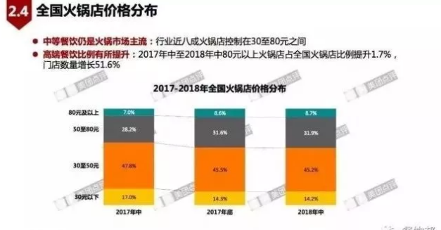 從2017年到2018年整體來看,30-50元、50-80元的火鍋店價格,為火鍋市場主流。從數(shù)據(jù)可見,2017年中至2018年中80元火鍋店占全國火鍋店比例提升1.7%。隨著消費升級,火鍋的高端餐飲比例有所提升。