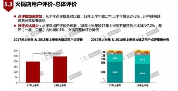 從大眾點評的數(shù)據(jù)看到,越來越多的火鍋用戶愿意分享就餐體驗。但火鍋店的整體評分降低,18年上半年較17年上半年五星評價占比減少7.2%,差評占比增加。