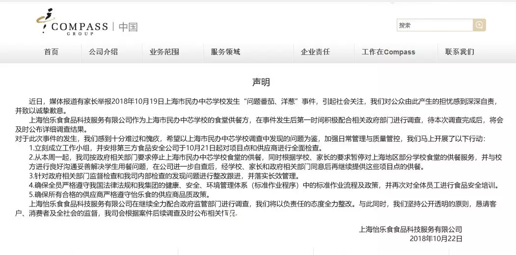根據(jù)學校的通報情況,該食堂的供應商是上海怡樂食食品科技服務(wù)有限公司,由康帕斯(compass)百分百占股,已經(jīng)為中芯國際學校服務(wù)四年。