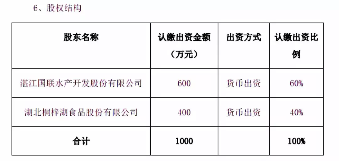 來(lái)源: 冷凍食品網(wǎng) 發(fā)布者:編輯11月13日晚間,國(guó)聯(lián)水產(chǎn)發(fā)布公告稱,公司已與湖北桐梓湖食品股份有限公司簽訂《合資合作協(xié)議書》,在荊州市監(jiān)利縣與湖北桐梓湖食品股份有限公司共同成立合資公司,國(guó)聯(lián)控股60%股份,合資公司首期投資金額為1億元。