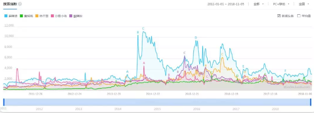 ▲百度指數(shù)顯示,麻辣燙的全網(wǎng)指數(shù)自2014年開始大幅提高