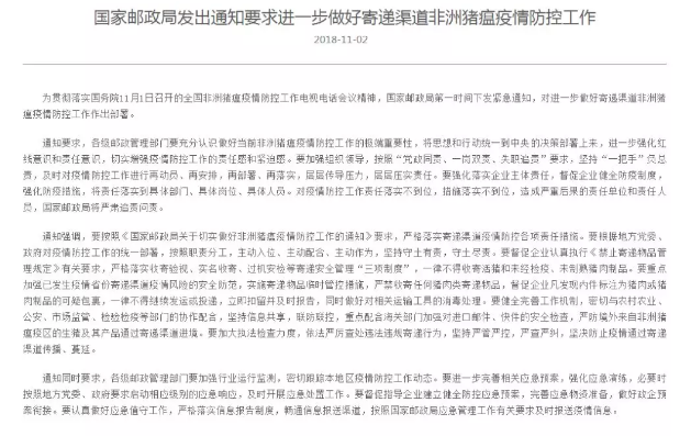 國(guó)家郵政局通知要求,各級(jí)郵政管理部門要充分認(rèn)識(shí)做好當(dāng)前非洲豬瘟疫情防控工作的極端重要性,將思想和行動(dòng)統(tǒng)一到中央的決策部署上來(lái),進(jìn)一步強(qiáng)化紅線意識(shí)和責(zé)任意識(shí),切實(shí)增強(qiáng)疫情防控工作的責(zé)任感和緊迫感。要強(qiáng)化落實(shí)企業(yè)主體責(zé)任,督促企業(yè)健全防疫制度,強(qiáng)化防疫措施,將責(zé)任落實(shí)到具體部門、具體崗位、具體人員。