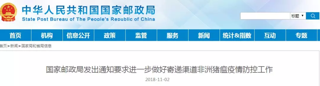 為貫徹落實(shí)國(guó)務(wù)院全國(guó)非洲豬瘟疫情防控工作電視電話會(huì)議精神,日前,國(guó)家郵政局下發(fā)緊急通知,嚴(yán)禁收寄任何豬肉類寄遞物品,督促企業(yè)凡發(fā)現(xiàn)內(nèi)件標(biāo)注為豬肉或豬肉制品的可疑包裹,一律不得繼續(xù)發(fā)運(yùn)或投遞,立即扣留并及時(shí)報(bào)告,同時(shí)做好對(duì)相關(guān)運(yùn)輸工具的消毒處理,堅(jiān)決防止非洲豬瘟疫情通過(guò)寄遞渠道傳播、蔓延。