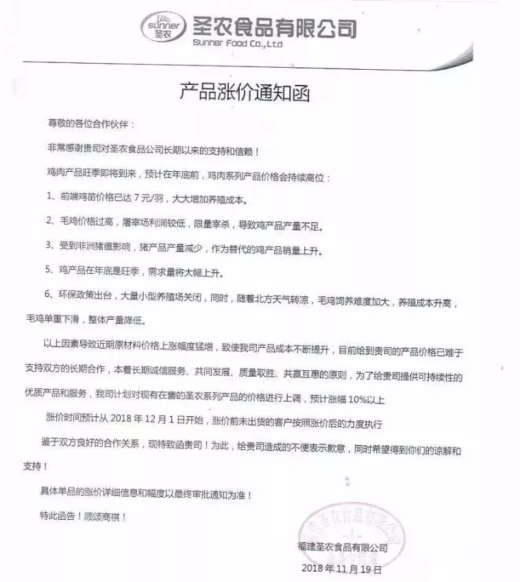 白羽雞上市公司圣農(nóng)食品發(fā)布了漲價(jià)通知,稱因受到非洲豬瘟影響,豬產(chǎn)品產(chǎn)量減少,作為替代品的雞產(chǎn)品銷量上升;與此同時(shí),大量小型養(yǎng)殖場因環(huán)保原因關(guān)閉、加上北方天氣轉(zhuǎn)涼、養(yǎng)殖成本升高,造成了整體毛雞產(chǎn)量變低。“計(jì)劃對現(xiàn)有在售的圣農(nóng)系列產(chǎn)品價(jià)格上調(diào)10%以上。”