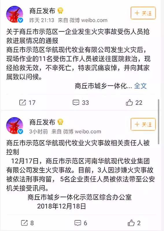 12月17日,河南商丘城鄉(xiāng)一體化示范區(qū)華航現(xiàn)代牧業(yè)有限公司廠區(qū)發(fā)生火災(zāi)。據(jù)商丘市人民政府新聞辦通報(bào),火災(zāi)已致11人死亡。