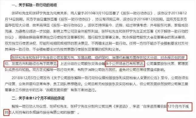 公告表示,張軒松和張軒寧在公司發(fā)展方向、發(fā)展戰(zhàn)略、組織架構(gòu)、治理機制等方面存在較大分歧,對永輝云創(chuàng)(超級物種)的定位、發(fā)展方向和路徑也有不同意見。為避免分歧進一步加劇,影響上市公司及全體股東利益,張軒松先生和張軒寧先生正式簽署《關(guān)于解除一致行動的協(xié)議》。