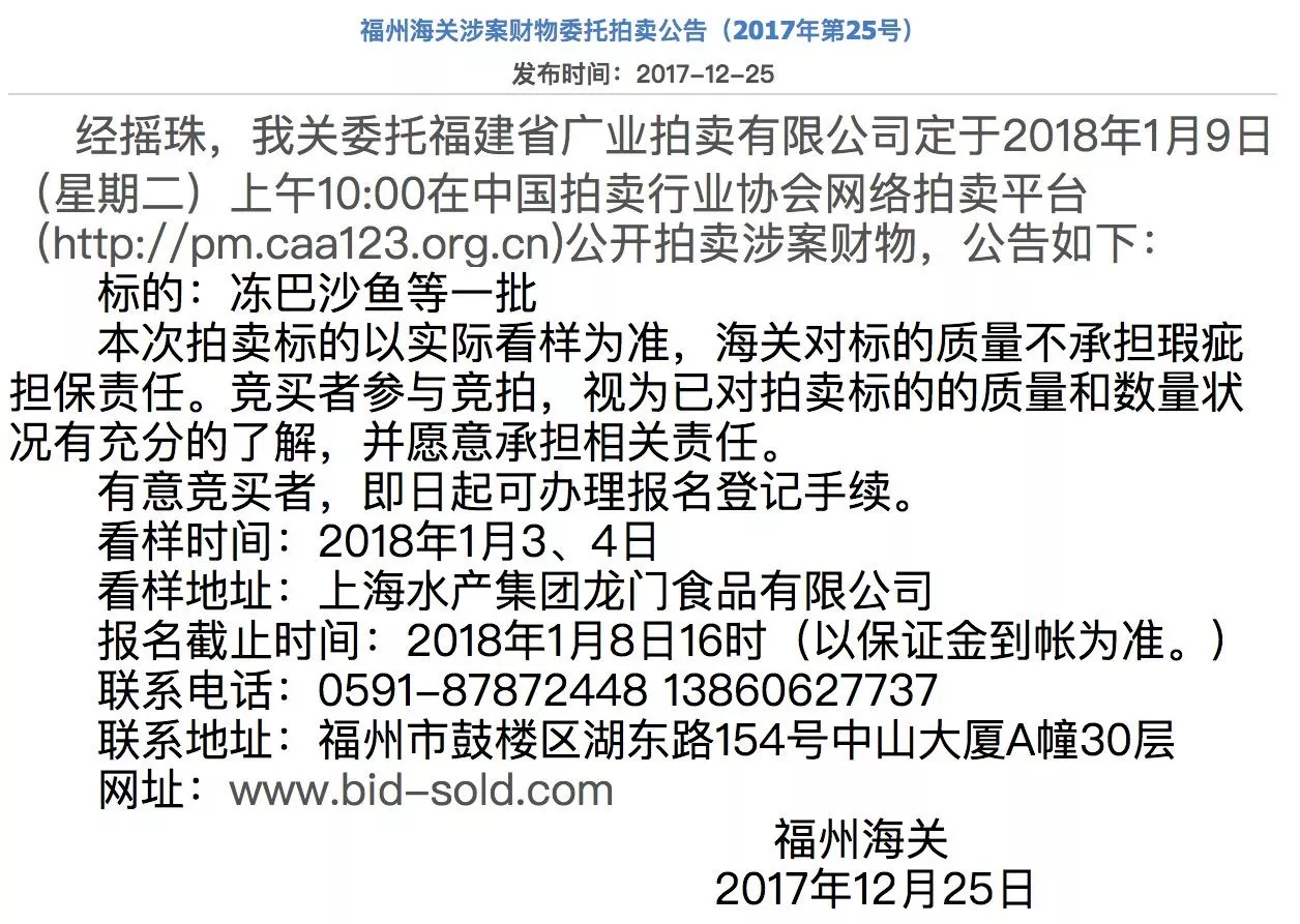 此次拍賣全程在網(wǎng)上進(jìn)行,由福建廣業(yè)拍賣有限公司在中國拍賣行業(yè)協(xié)會網(wǎng)絡(luò)拍賣平臺具體執(zhí)行,拍賣公告于12月25日由福建海關(guān)發(fā)布,看樣時間已經(jīng)在2018年1月3日和4日完成,拍賣產(chǎn)品全部儲存在上海水產(chǎn)集團(tuán)龍門食品有限公司的倉庫中。