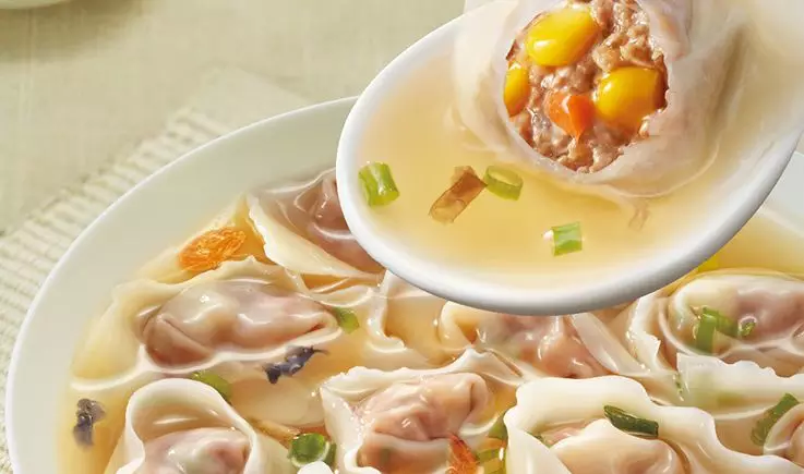 金牌蝦云吞屬于廣式云吞——普通云吞單顆重量一般在12g,廣式云吞單顆15g,為的就是“能包下一整只蝦”。不過(guò),這款云吞產(chǎn)品的皮中加入了雞蛋,呈淡黃色,而非廣式云吞皮普遍加堿后呈現(xiàn)的黃色,口感更為爽滑。據(jù)悉,蝦仁云吞占據(jù)高端市場(chǎng)68%、中高端市場(chǎng)30%的份額。