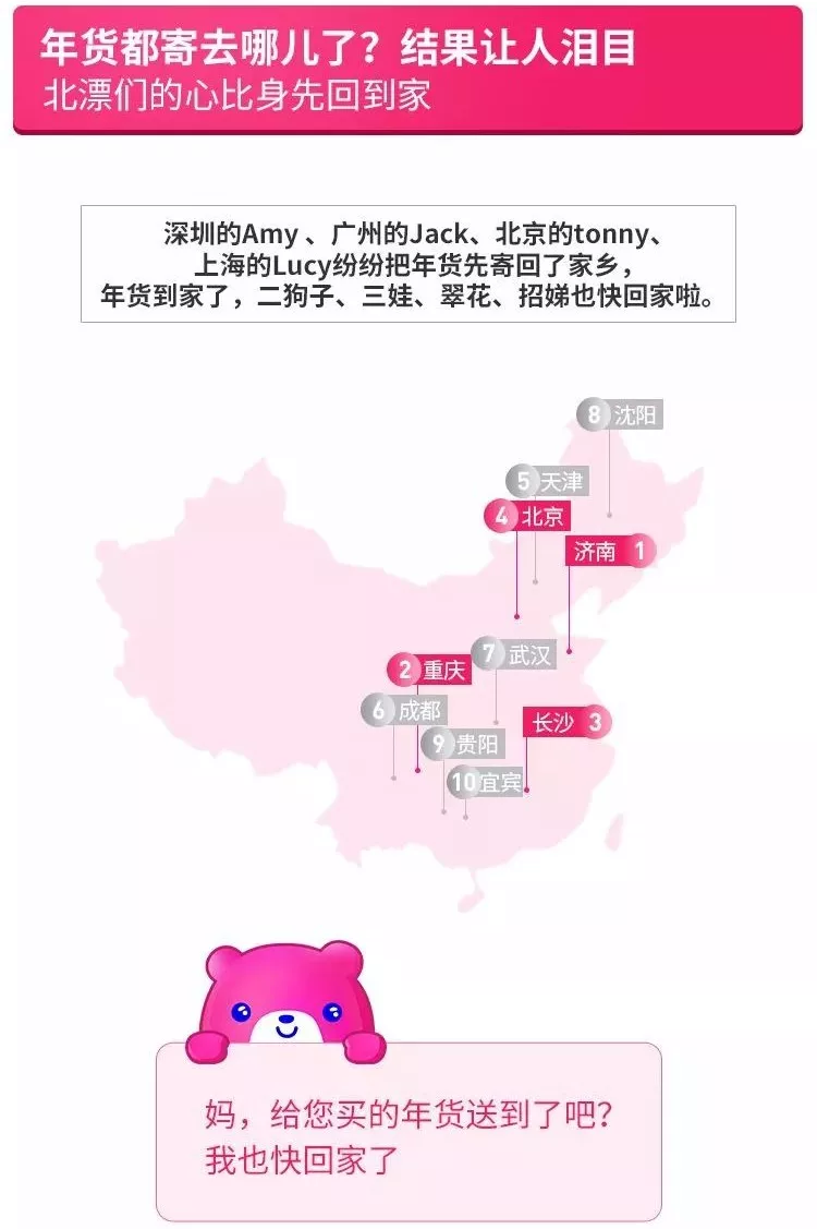 年貨比人先到家已經(jīng)成為很多“漂”們的新選擇。在外辛苦工作一年的“漂們”,思鄉(xiāng)情緒在春節(jié)前集中爆發(fā),他們大多數(shù)會(huì)選擇提前為遠(yuǎn)方的親人挑選年貨,把愛(ài)和牽掛郵寄回家。數(shù)據(jù)顯示,超過(guò)9成外地工作的用戶會(huì)線上購(gòu)買(mǎi)年貨禮盒寄回家鄉(xiāng),其中濟(jì)南、長(zhǎng)沙、重慶成為收到年貨禮盒最多的城市。