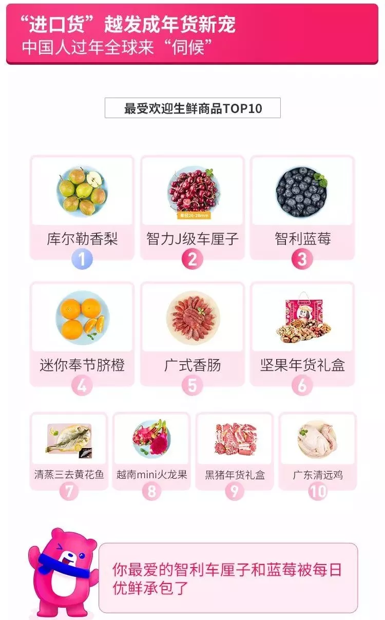 從整體生鮮品類(lèi)來(lái)看,水果、肉類(lèi)和乳品占據(jù)品類(lèi)TOP榜前三位置。隨著國(guó)人飲食日益健康化,水果的受歡迎程度持續(xù)走高,占比約為25.7%。值得注意的是,在最受歡迎的十大生鮮年貨商品排行中,庫(kù)爾勒香梨、廣式香腸、黑豬年貨禮盒、智利車(chē)?yán)遄印⒅抢{(lán)莓、越南mini火龍果排名靠前,成為國(guó)人年貨新寵。