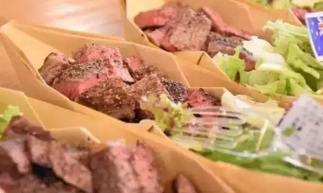 煎好的牛排分切后盛放在紙盒里,撒上海鹽和黑胡椒,并搭配一些蔬菜沙拉。整個過程只需三五分鐘。
