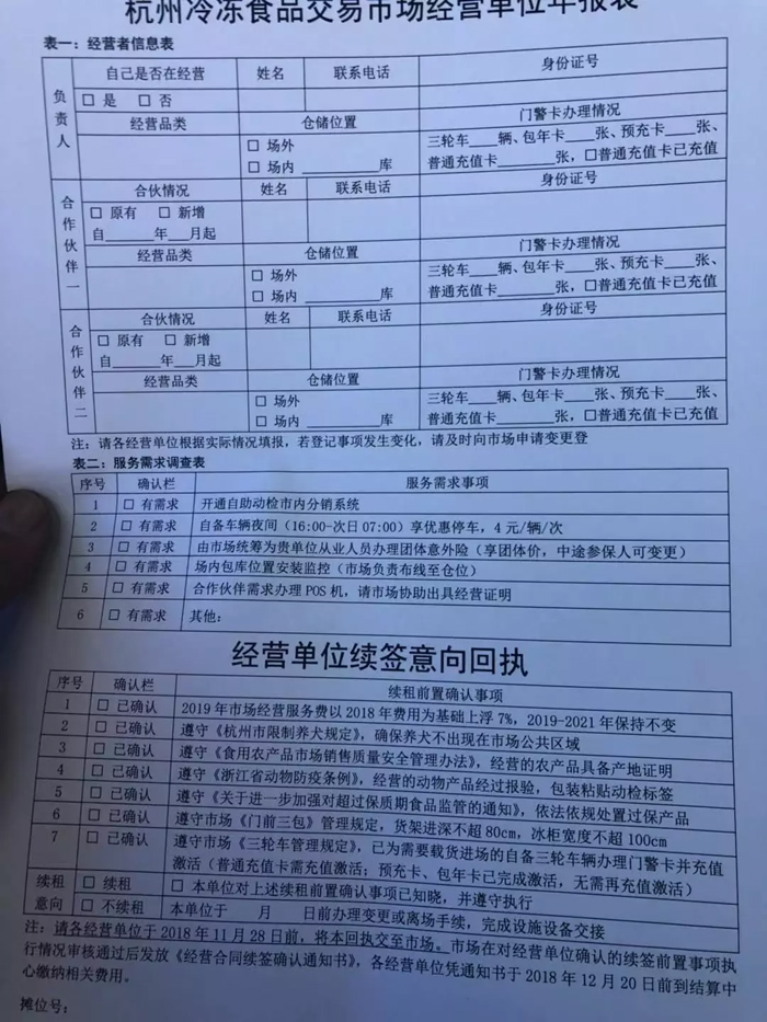 “每年最后一次攤位費和冷庫費一起算,經(jīng)營單位續(xù)簽意向回執(zhí)一欄中七個確認欄必須全部同意才給交費,不同意就不能續(xù)簽。”商戶張某說。