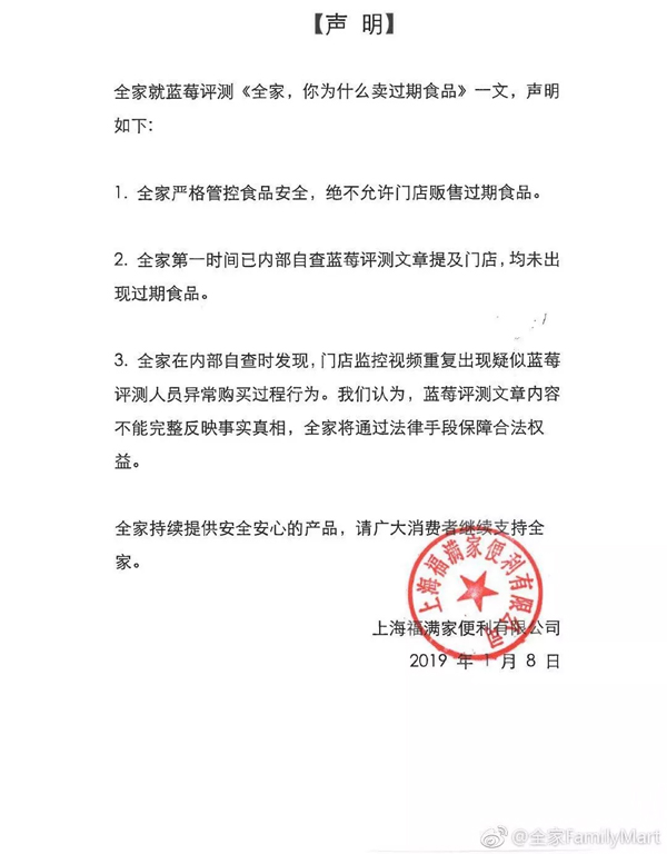 全家便利店1月8日在官方微博上發(fā)表聲明