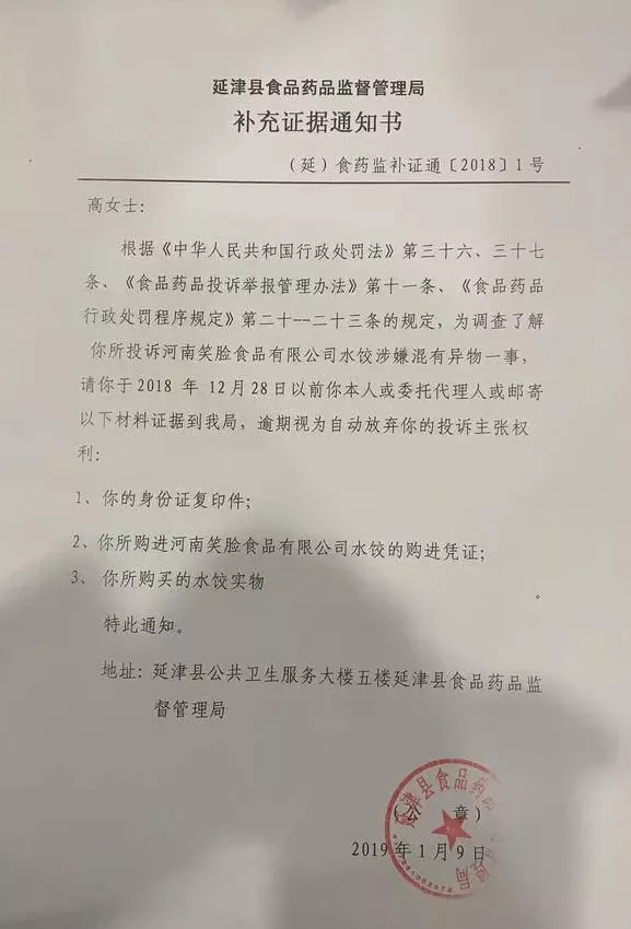 在這份《補(bǔ)充證據(jù)通知書》上,延津縣食藥監(jiān)局稱,為調(diào)查高女士所投訴的河南笑臉食品有限公司水餃涉嫌混有異物一事,高女士應(yīng)在2018年12月28日以前本人或委托代理人或郵寄材料證據(jù)到當(dāng)?shù)厥乘幈O(jiān)局,逾期視為自動(dòng)放棄投訴主張權(quán)利。加蓋公章的文件落款時(shí)間為2019年1月9日。