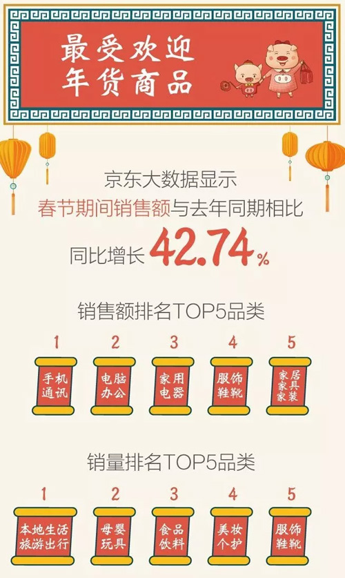 據(jù)京東大數(shù)據(jù)顯示,春節(jié)期間銷售額與去年同期相比,同比增長42.74%。