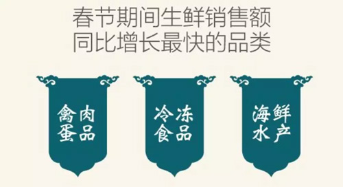 與去年同期相比,春節(jié)期間生鮮銷售額同比增長最快的品類是禽肉蛋品、冷凍食品、海鮮水產(chǎn),冷凍食品是當(dāng)之無愧的“銷量冠軍”。