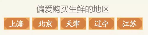 從地域上來看,購買生鮮較多地區(qū)的城市為,上海、北京、天津、遼寧、江蘇。南方偏愛湯圓,北方更喜歡速凍水餃。而水產(chǎn)海鮮類則是所有城市消費(fèi)者的最愛。