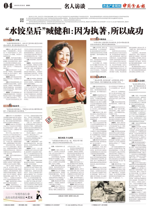 2010年3月,報社組織“冷凍食品行業(yè)杰出女性系列報道”,其中的一篇便是對臧健和的專訪。