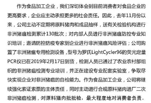 三全食品稱, 公司購置的非洲豬瘟專用檢測設(shè)備已于2月17日到貨,檢測人員也已通過了農(nóng)業(yè)農(nóng)村部組織的非洲豬瘟檢測專業(yè)培訓(xùn),并正在建設(shè)專業(yè)配套實(shí)驗(yàn)室,爭取盡快實(shí)現(xiàn)企業(yè)對(duì)非洲豬瘟的自檢能力。