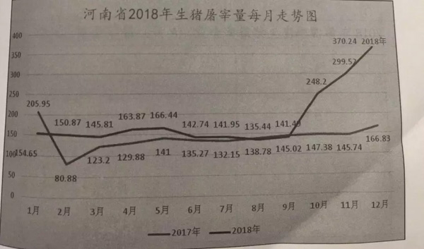 從生豬屠宰量上看,2018年第四季度河南省交出了一份不錯的答卷。該季度,河南省屠宰企業(yè)(A類)生豬屠宰量為917.96萬頭,較去年同期增加378.76萬頭,同比增長70.24%。其中,12月份生豬屠宰量更是達到了370.24萬頭的高位。