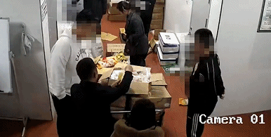 根據(jù)現(xiàn)場監(jiān)控畫面顯示,3月12日22時24分,圖像中央聚集了幾名家長,其中一位穿著黑色夾克的男子從地上撿起一袋姜黃粉( 一種調(diào)味料),撕開,灑向堆放在推車最上方的一箱冷凍雞腿上, 隨后摸出手機拍照。