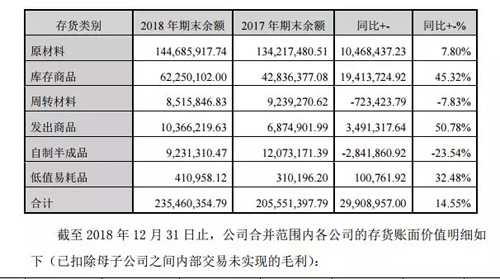 1、截至2018年12月31日止,公司合并報(bào)表存貨項(xiàng)目同比增加29,908,957.00元,同比增長14.55%,具體數(shù)據(jù)如下表: