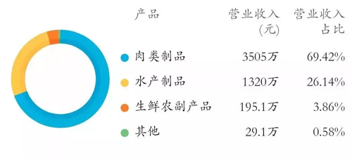 從數(shù)據(jù)中發(fā)現(xiàn),潮庭食品營業(yè)收入來源主要以肉類制品為主,其次是水產(chǎn)制品。