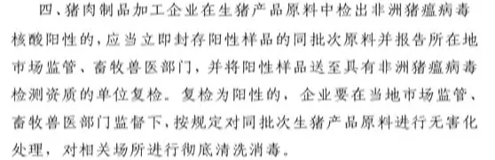 第四,公告明確,豬肉制品企業(yè)在檢出生豬原料中非洲豬瘟病毒核酸陽性的,應(yīng)該如何處置。