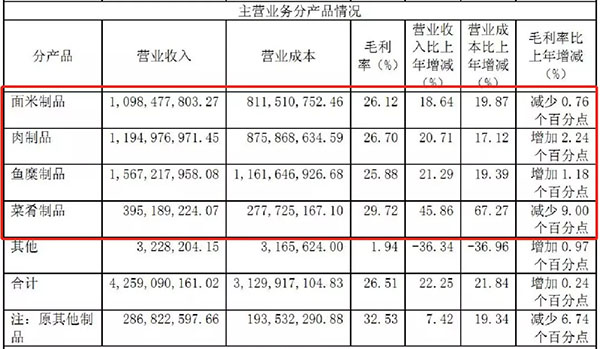 值得注意的是,菜肴制品2018年?duì)I收3.95億元,占總營(yíng)收的9.28%。雖然這個(gè)比重不算太大,但菜肴制品的營(yíng)收比上年增長(zhǎng)45.86%,毛利率更是高達(dá)29.72%,發(fā)展速度非常驚人。