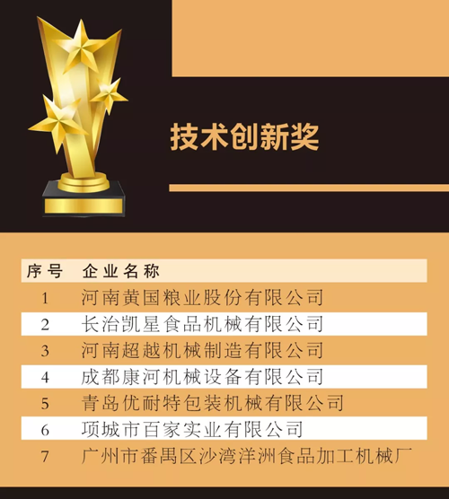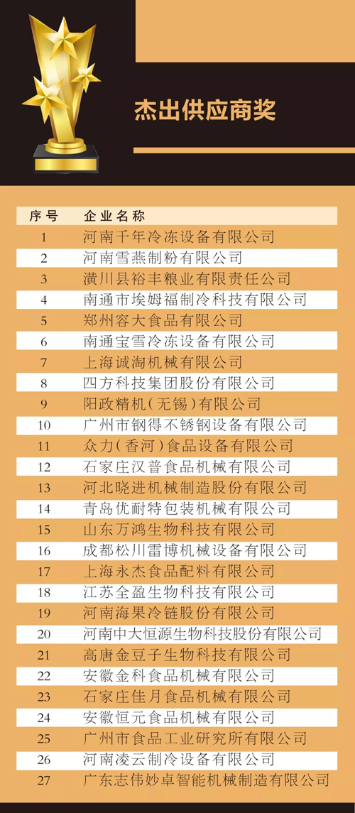 來源: 冷凍食品網(wǎng) 發(fā)布者:編輯8月18日上午,在2019中國(guó)冷凍食品產(chǎn)業(yè)大會(huì)優(yōu)秀展商頒獎(jiǎng)典禮上,最具影響力企業(yè)獎(jiǎng)、技術(shù)創(chuàng)新獎(jiǎng)、成長(zhǎng)新星產(chǎn)品獎(jiǎng)、杰出供應(yīng)商獎(jiǎng)4大獎(jiǎng)項(xiàng)名單滾燙出爐。