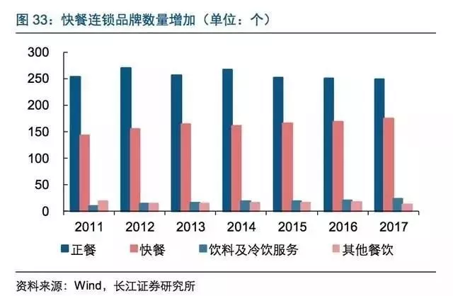 對比了2011年以來限額以上餐飲企業(yè)收入占社零餐飲收入的比值會發(fā)現(xiàn),2013年之前比值呈上升趨勢,但近年來則出現(xiàn)明顯的階梯下降態(tài)勢,表明行業(yè)分散化的格局或在加劇。從結(jié)構(gòu)上看,快餐連鎖品牌占比大幅增加,正餐連鎖品牌小幅下降,新興品牌的規(guī)模通常較小,因此也進一步加劇了行業(yè)分散的趨勢。