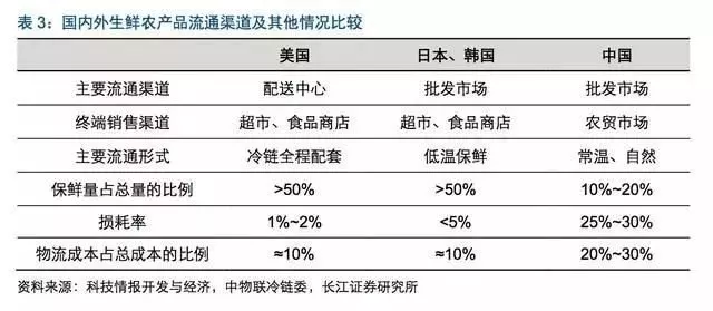 中國生鮮食品流通效率低下且安全問題突出。據(jù)不完全統(tǒng)計,2015年我國果蔬、肉類、水產(chǎn)品的冷鏈流通率分別達到22%、34%、41%,冷藏運輸率分別為35%、57%、69%。與發(fā)達國家相比,差距巨大。