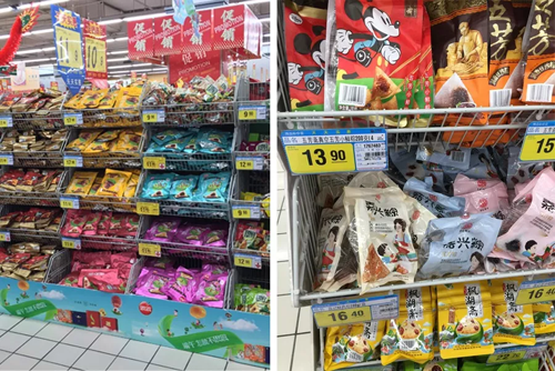 值得一提的是,今年端午,單只裝、兩只裝或四只裝的小包裝粽子特別多,尤其是常溫粽子,擺放在日常用于陳列休閑零食的貨架上,特別搶眼。
