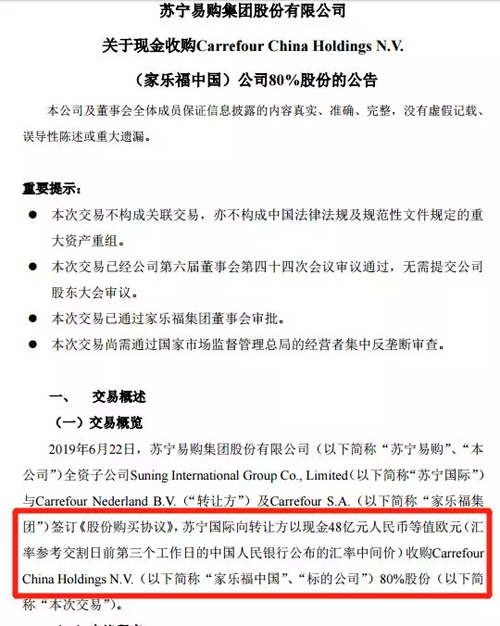 6月23日下午,蘇寧易購(gòu)公告稱(chēng),蘇寧易購(gòu)全資子公司蘇寧國(guó)際與家樂(lè)福集團(tuán)達(dá)成協(xié)議,擬48億元收購(gòu)家樂(lè)福中國(guó)80%股份。