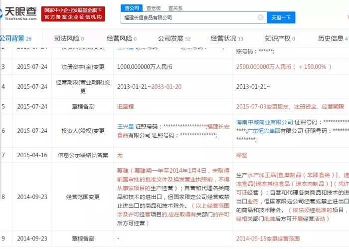 天眼查信息顯示,2014年9月23日,長恒食品進(jìn)行了經(jīng)營范圍變更,在原有自營和代理各類商品和技術(shù)的進(jìn)出口(國家限定公司經(jīng)營或禁止進(jìn)出口的商品和技術(shù)除外)基礎(chǔ)上,增加了生產(chǎn)水產(chǎn)加工品魚糜制品(非即食類)、速凍食品速凍其他食品(速凍肉制品)(憑許可證經(jīng)營)。