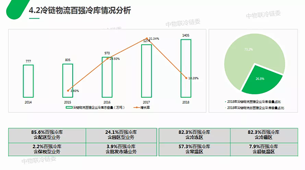 冷鏈物流百強企業(yè)冷庫資源方面顯示,2018年投入使用的冷庫共約1405萬噸(折合3513萬立方米),較去年百強增長10.28%。百強企業(yè)冷庫總量約可占到總容量的26.8%,與往年百強冷庫容量占比基本持平。截至2018年年底,我國冷庫總量達到5238萬噸(折合1.3億立方米)。