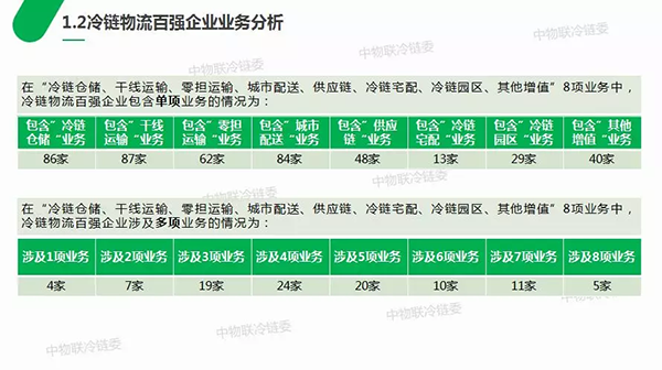 2018年冷鏈物流百強企業(yè)中業(yè)務著重布局的前三名分別是:干線運輸、冷鏈倉儲、城市配送,開展冷鏈宅配、冷鏈園區(qū)業(yè)務的百強企業(yè)較少。同時,可以看出當前單一業(yè)務類型的冷鏈物流企業(yè)數(shù)量極少,大部分冷鏈物流企業(yè)涉及3-5項業(yè)務,涉及業(yè)務類型多元,紛紛向綜合冷鏈物流服務企業(yè)轉型,未來冷鏈物流發(fā)展將向供應鏈方向邁進。