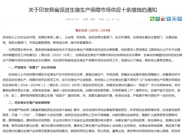 7月25日,廣東省農(nóng)業(yè)農(nóng)村廳官方網(wǎng)站公布《關(guān)于印發(fā)我省促進生豬生產(chǎn)保障市場供應十條措施的通知》(簡稱”《通知》”)。