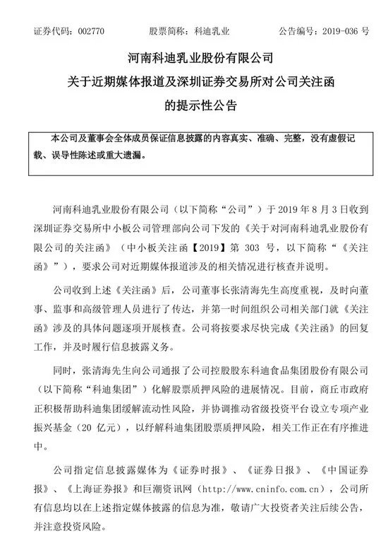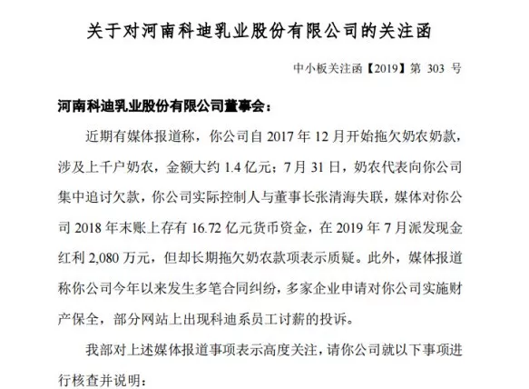 8月3日,在風(fēng)口浪尖上的科迪乳業(yè)收到深圳證券交易所中小板關(guān)注函,要求其就媒體報道的科迪乳業(yè)拖欠奶農(nóng)奶款、公司貨幣資金、合同糾紛等問題進(jìn)行說明,并要求2019年8月9日前回復(fù)。