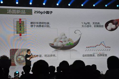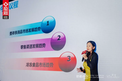 龍鳳食品市場(chǎng)總監(jiān)李聰博在會(huì)上發(fā)言,總結(jié)了加入三全體系的六年間,龍鳳做的八件事,并為多款新品“代言”。