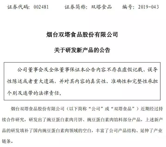 9月4日,一家上市公司的公告完美地蹭上了中秋節(jié)的熱點。雙塔食品(002481.SZ)發(fā)布公告稱公司成功研發(fā)出了豌豆蛋白素肉月餅、豌豆蛋白素肉餡料部分產(chǎn)品,填補(bǔ)了國內(nèi)豌豆蛋白素肉領(lǐng)域的空白。