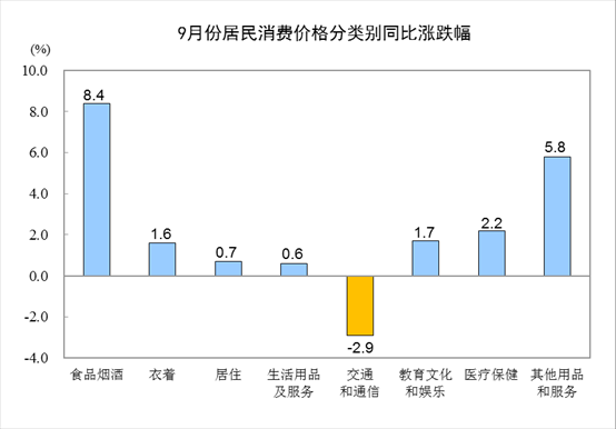 9月份,食品煙酒價(jià)格同比上漲8.4%,影響CPI(居民消費(fèi)價(jià)格指數(shù))上漲約2.49個(gè)百分點(diǎn)。其中,畜肉類價(jià)格上漲46.9%,影響CPI上漲約2.03個(gè)百分點(diǎn)(豬肉價(jià)格上漲69.3%,影響CPI上漲約1.65個(gè)百分點(diǎn));禽肉類價(jià)格上漲14.7%,影響CPI上漲約0.18個(gè)百分點(diǎn);雞蛋價(jià)格上漲9.4%,影響CPI上漲約0.05個(gè)百分點(diǎn);鮮果價(jià)格上漲7.7%,影響CPI上漲約0.13個(gè)百分點(diǎn);水產(chǎn)品價(jià)格上漲2.9%,影響CPI上漲約0.05個(gè)百分點(diǎn);糧食價(jià)格上漲0.6%,影響CPI上漲約0.01個(gè)百分點(diǎn);鮮菜價(jià)格下降11.8%,影響CPI下降約0.33個(gè)百分點(diǎn)。
