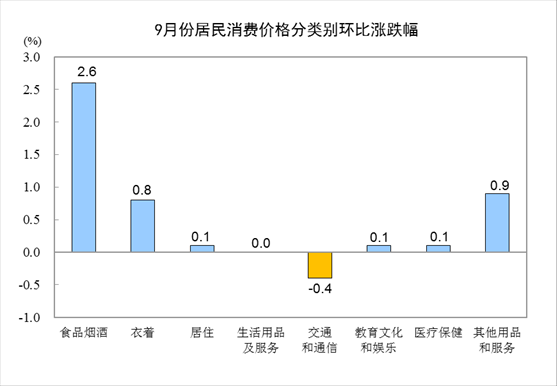9月份,全國(guó)居民消費(fèi)價(jià)格環(huán)比上漲0.9%。其中,城市上漲0.7%,農(nóng)村上漲1.3%;食品價(jià)格上漲3.5%,非食品價(jià)格上漲0.2%;消費(fèi)品價(jià)格上漲1.5%,服務(wù)價(jià)格下降0.1%。