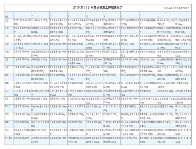 來(lái)源: 冷凍食品網(wǎng) 發(fā)布者:編輯2019年11月份各地速凍水餃銷售排名揭曉: