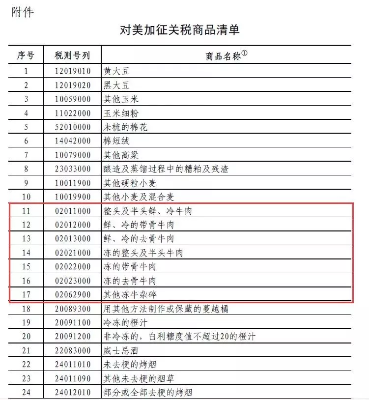 當(dāng)天,根據(jù)《中華人民共和國對(duì)外貿(mào)易法》和中華人民共和國進(jìn)出口條例相關(guān)規(guī)定,及經(jīng)國務(wù)院批準(zhǔn),國務(wù)院關(guān)稅稅則委員會(huì)決定,對(duì)原產(chǎn)于美國的大豆、汽車和牛肉等14類106項(xiàng)商品加征25%關(guān)稅。