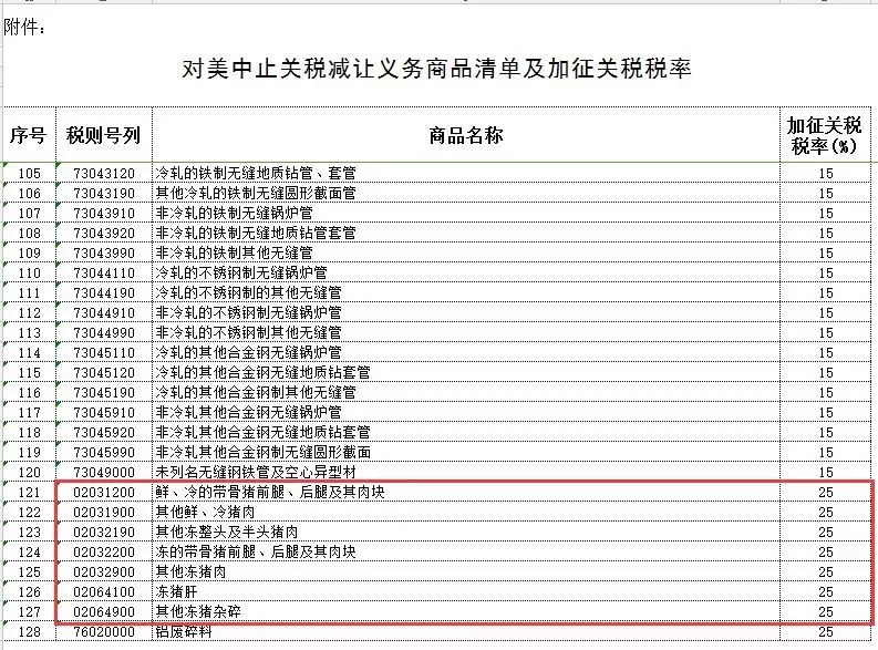 作為回應(yīng),經(jīng)中國國務(wù)院批準(zhǔn),國務(wù)院關(guān)稅稅則委員會(huì)決定自2018年4月2日起,對(duì)原產(chǎn)于美國的7類128項(xiàng)進(jìn)口商品中止關(guān)稅減讓義務(wù),在現(xiàn)行的適用關(guān)稅稅率基礎(chǔ)上加征關(guān)稅,其中美國豬肉各類產(chǎn)品赫然在列。