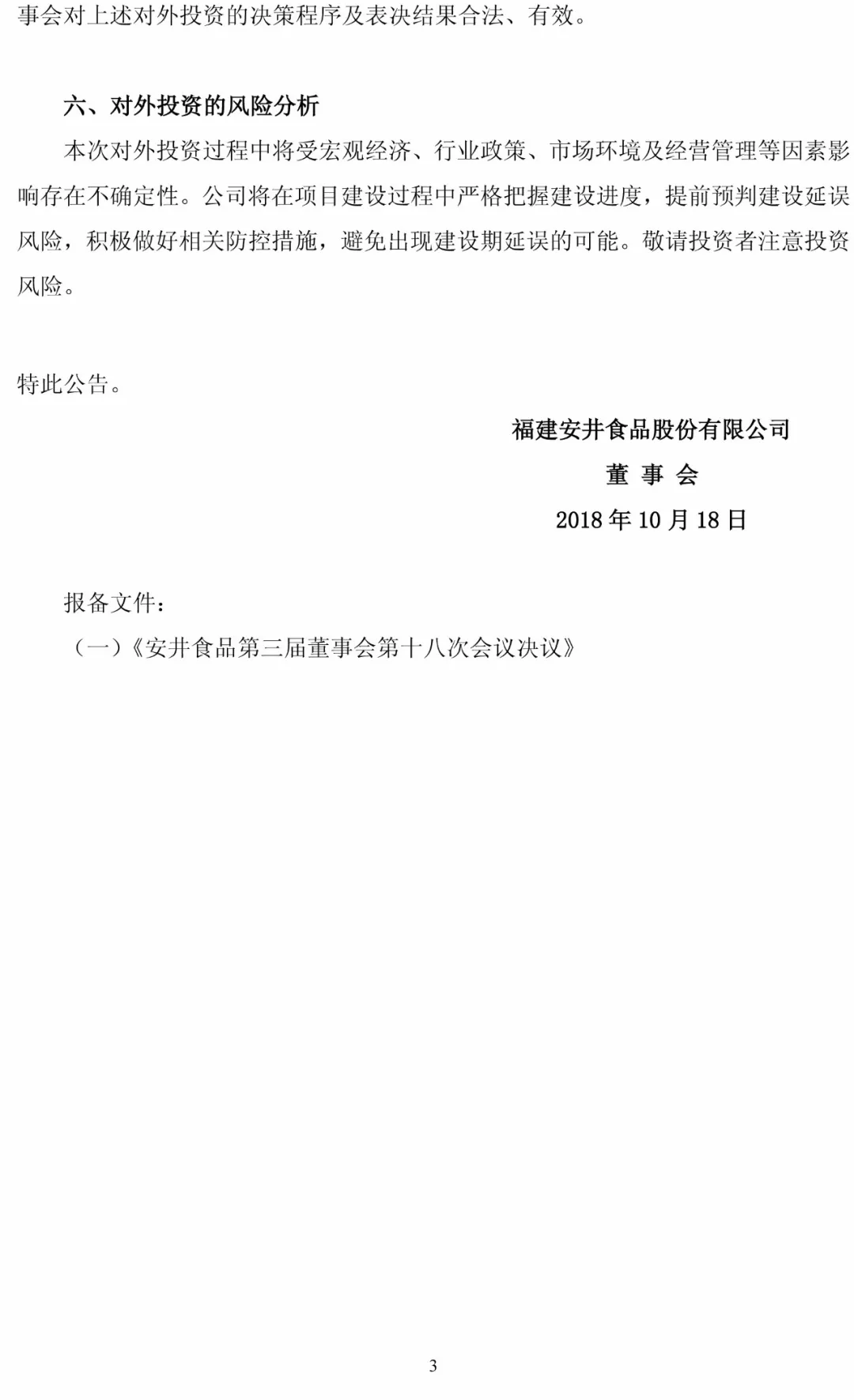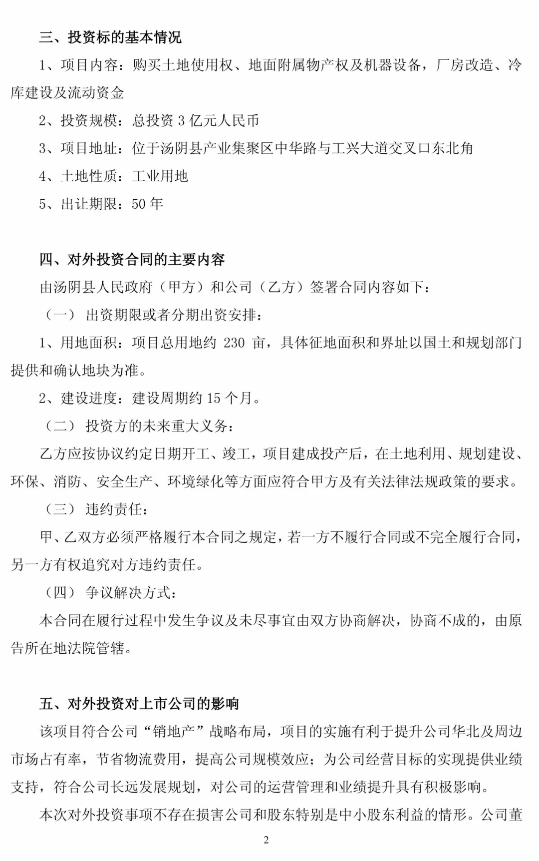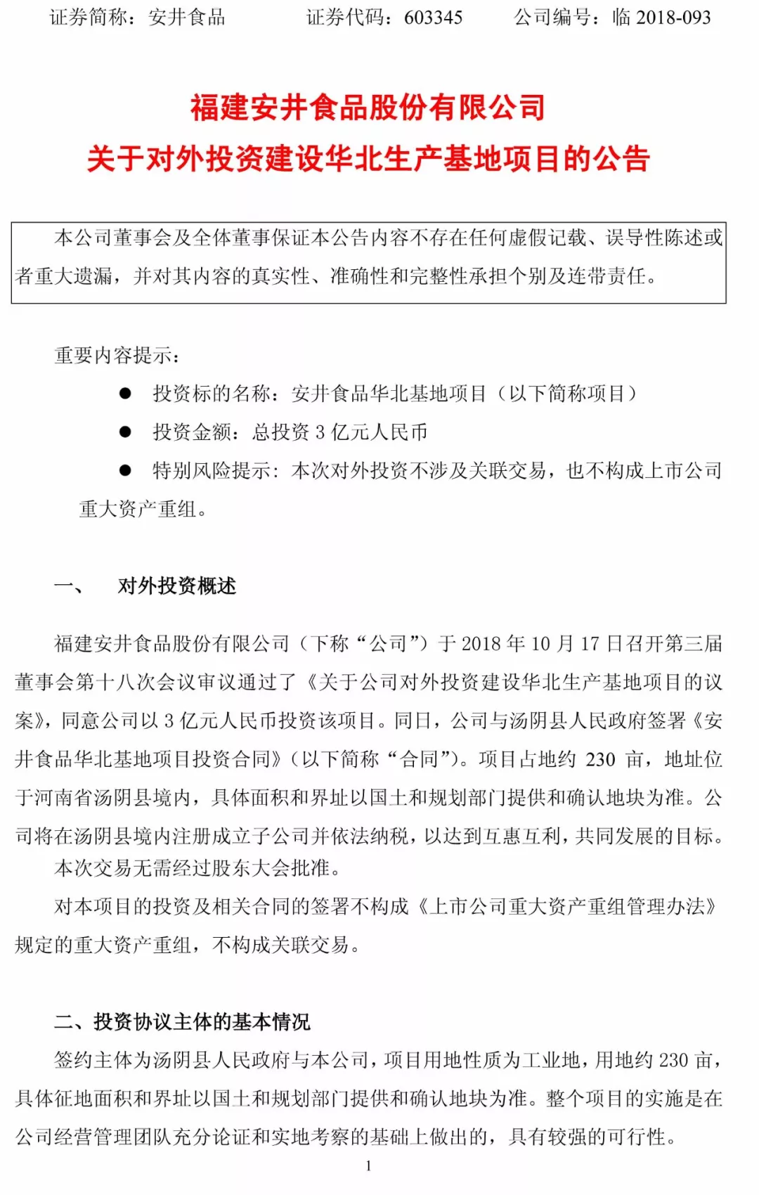 10月17日,安井食品召開第三屆董事會第十八次會議,審議通過了《關(guān)于公司對外投資建設華北生產(chǎn)基地項目的議案》,同意公司以3億元人民幣投資該項目。同日,公司與湯陰縣人民政府簽署《安井食品華北基地項目投資合同》。